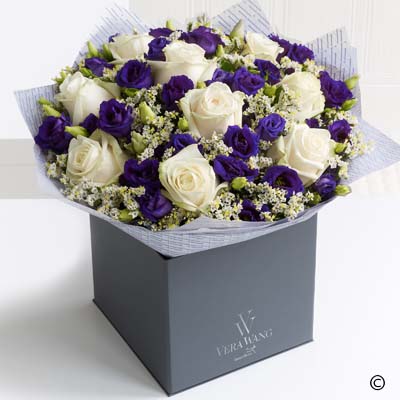 Featuring Ice Bear cream roses, purple double lisianthus and fresh limonium, expertly hand-tied and finished with luxurious Vera Wang gift wrapping.