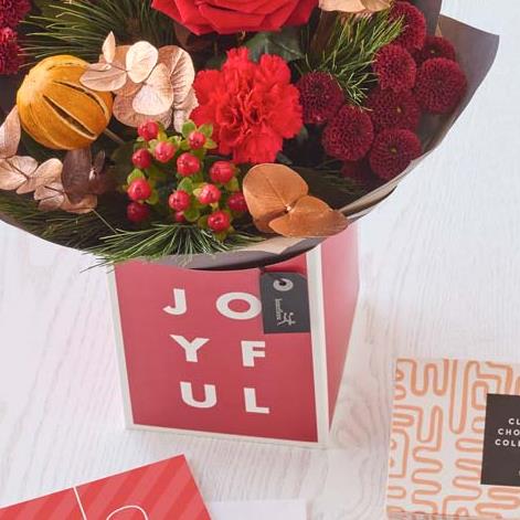 A handcrafted bouquet in a cute Christmas gift box, plus a lovely card and chocolate selection.