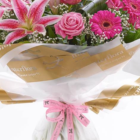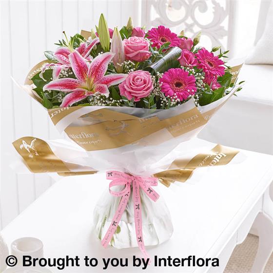 Featuring pink Oriental lily, pink large-headed roses, cerise germinis and pink lisianthus, hand-tied with gypsophila, aspidistra leaves, eucalyptus and salal, wrapped and trimmed with 'Happy Mother's Day' ribbon and presented in Interflora Gift Packaging.